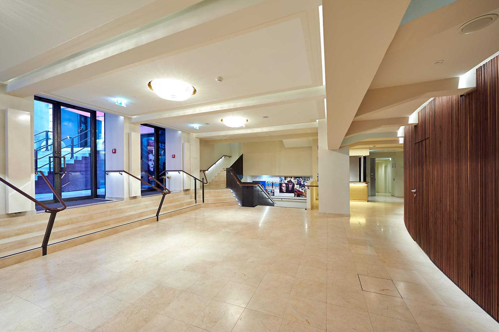 Im Zuschauerraum nehmen die geschwungenen Formen Bezug auf die bestehenden Bögen. Die verbesserten Sichtlinien im Zuschauerraum und das zusätzliche Pausenfoyer mit Buffet im Parkett rechts erhöhen den Komfort für die Zuschauer.